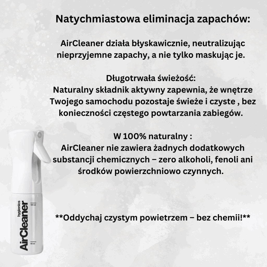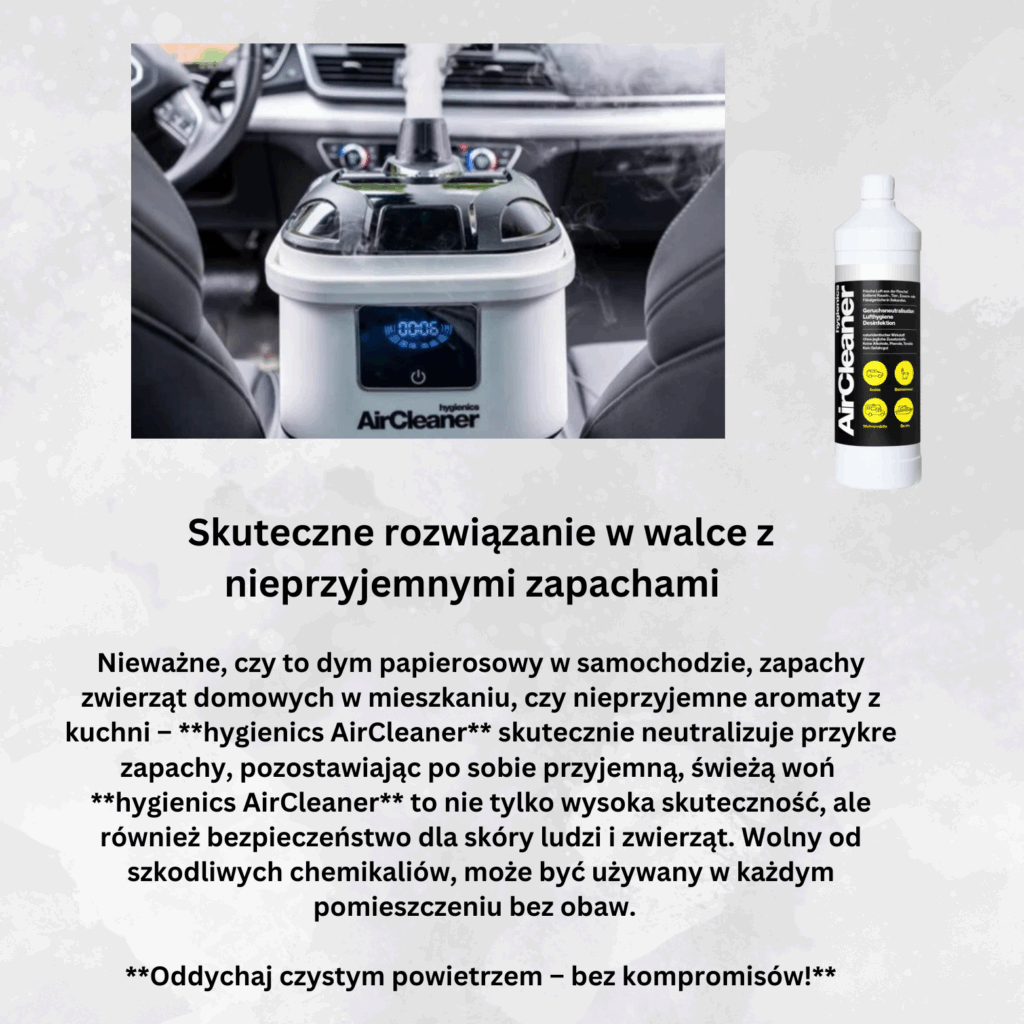 Do głębokiego czyszczenia wnętrza pojazdu używamy certyfikowanych urządzeń hygienics AirCleaner. Naturalne składniki aktywne eliminują źródło zapachu, zamiast go tylko maskować – efekt utrzymuje się przez wiele miesięcy.
